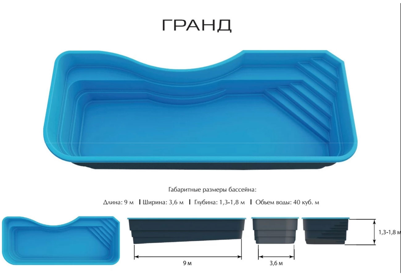 Гранд — модель, которая одинаково отлично подходит как для занятй спортом так и для отдыха. Яркая особенность бассейна Гранд — его форма. Благодаря закругленным краям и плавному изгибу чаша напоминает пруд или озеро. Поэтому такой бассейн гармонично дополнит и садовый ландшафт, и строгую архитектуру здания. Бассейн Гранд — самая глубокая модель в линейке. Чаша с переменной глубиной от 1,3 до 1,8 метра дает больше возможностей для занятий спортом и развлечений.У модели есть две зоны для сидения. Зоной отдыха также служат широкие угловые ступеньки. Для максимального комфорта выступы и спинки можно оснастить гидромассажем. Благодаря закругленным краям и плавному изгибу чаша напоминает пруд или озеро. Поэтому такой бассейн гармонично дополнит и садовый ландшафт, и строгую архитектуру здания. Гладкая поверхность без швов и острых углов не склонна к биозарастанию. Поэтому вода дольше остается чистой, а уход за композитным бассейном прост и экономичен.