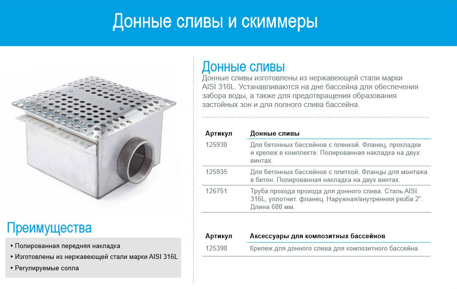 Донный слив для бассейнов облицованных пленкой. Изготовлен из кислотостойкой нержавеющей стали. Комплектуется фланцем, резиновым уплотнением и винтами. Полированная решетка крепится двумя винтами.